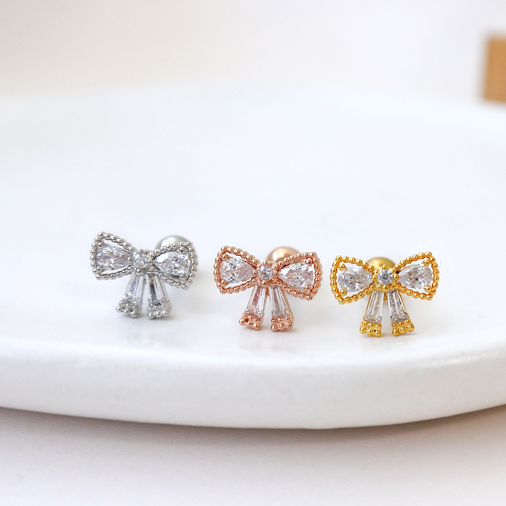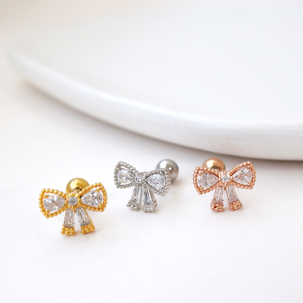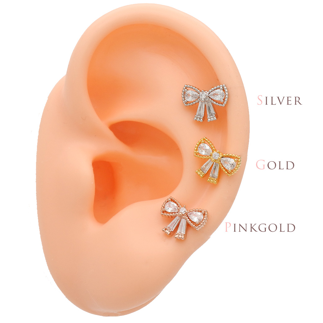 【11月再入荷】[14G 16G ]上品さの中に可愛さをプラスしたキュービック リボン モチーフ ストレート 軟骨ピアス ヘリックス ボディピアス 1022