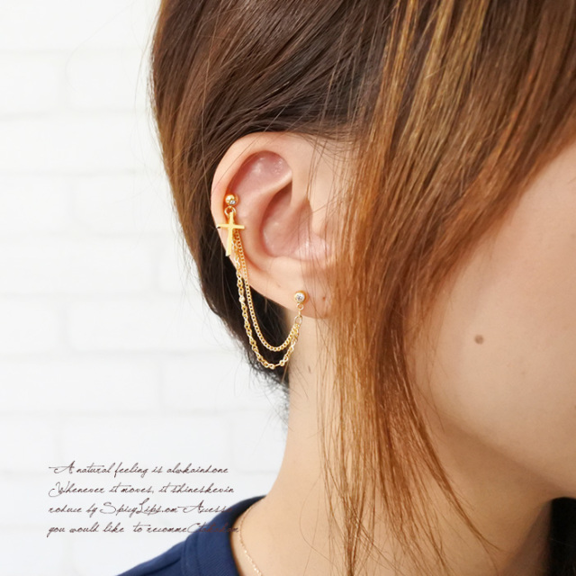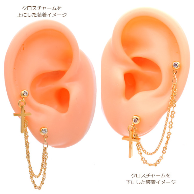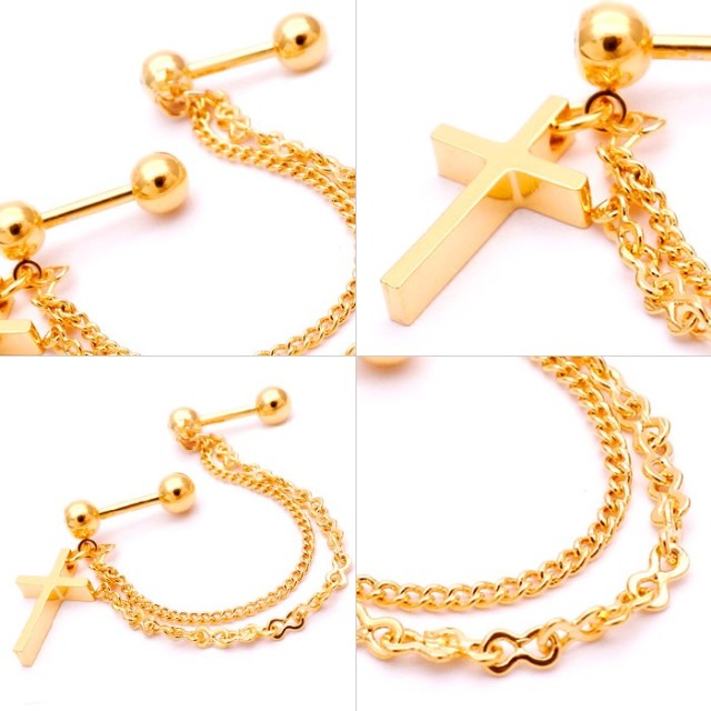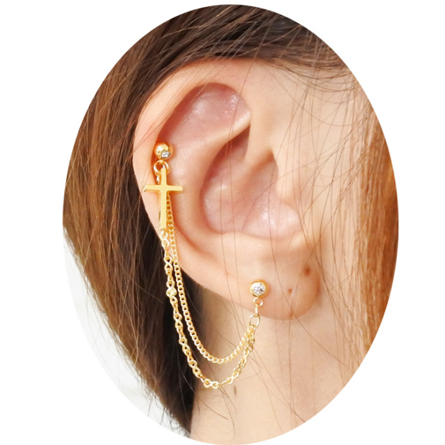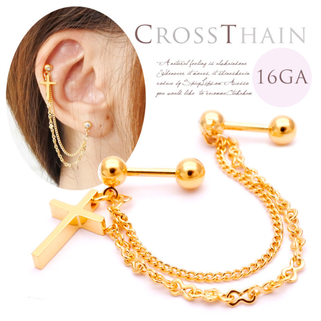 [16G]2つのホールを繋ぐチェーン★スタイリッシュメタルクロス軟骨ピアスボディピアス 0780