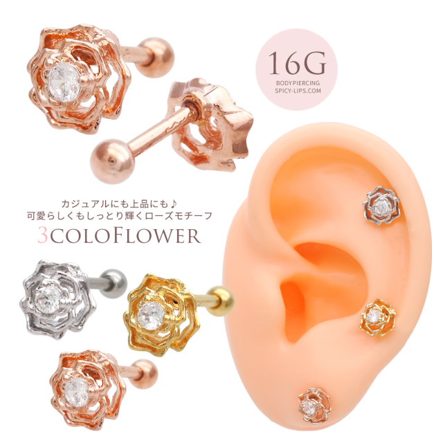 ★スペシャル★プライス★[16G]カジュアルにも上品にも♪可愛らしくもしっとり輝くローズモチーフ 花 フラワー 軟骨ピアス ヘリックス ボディピアス 0735