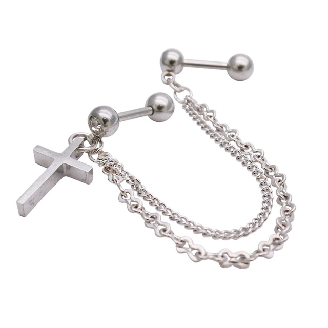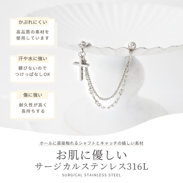 [14G 16G ]2つのホールを繋ぐチェーン★スタイリッシュメタルクロス軟骨ピアスボディピアス [シルバー] 0146
