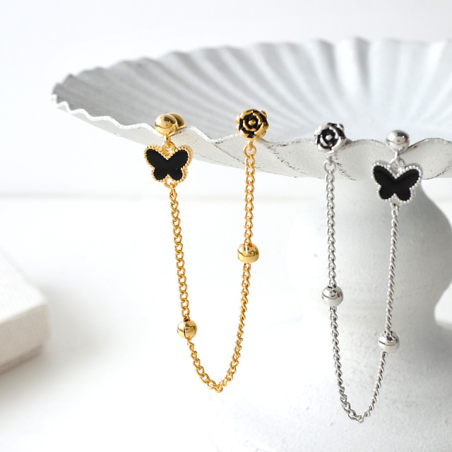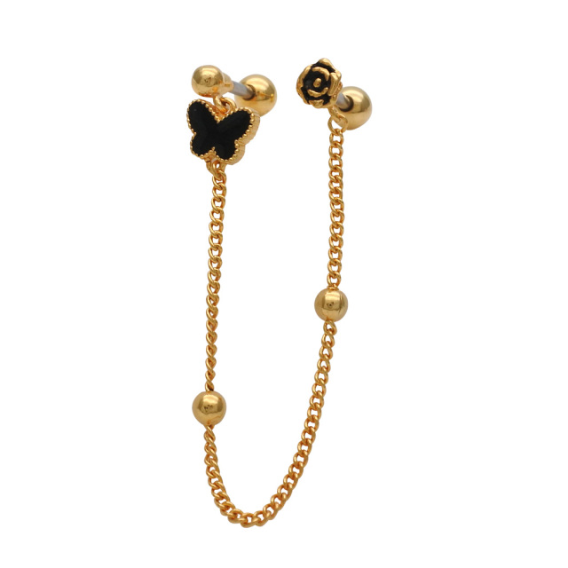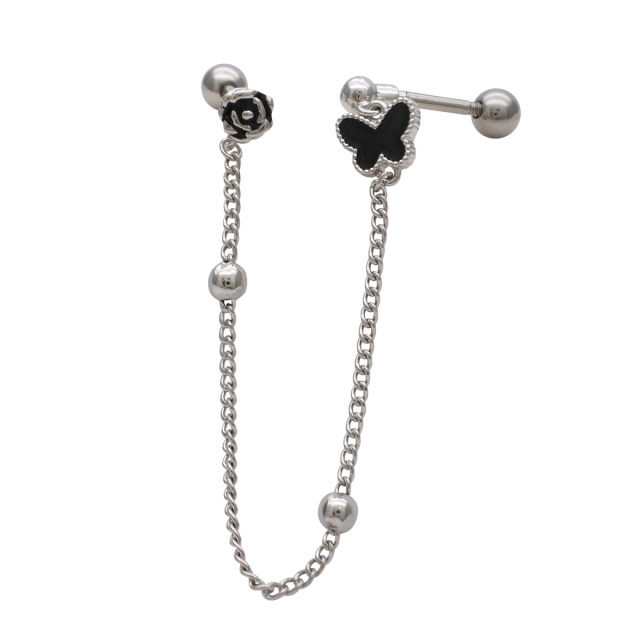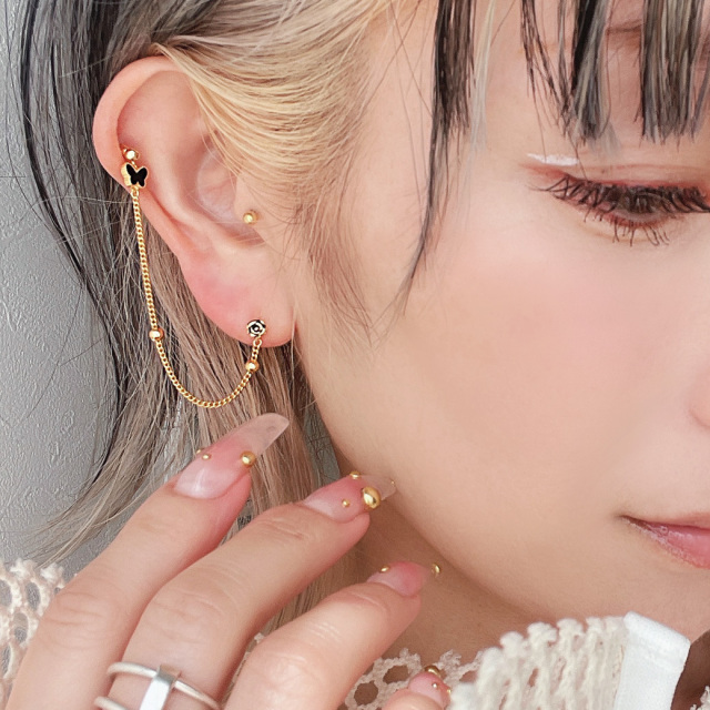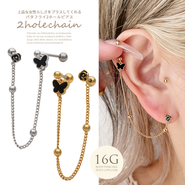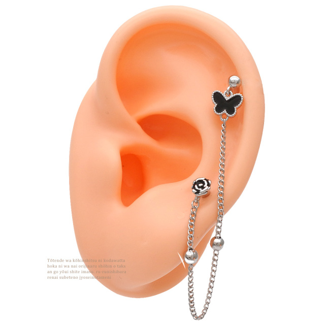[16G]上品な女性らしさをプラスしてくれる バタフライ ×フラワー 2ホール ジュエル チェーン ストレート 軟骨ピアス ヘリックス ボディピアス 0614