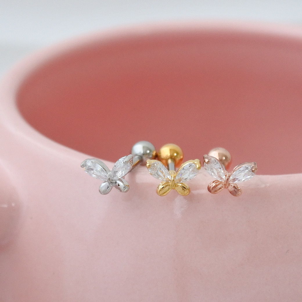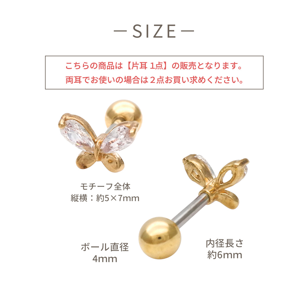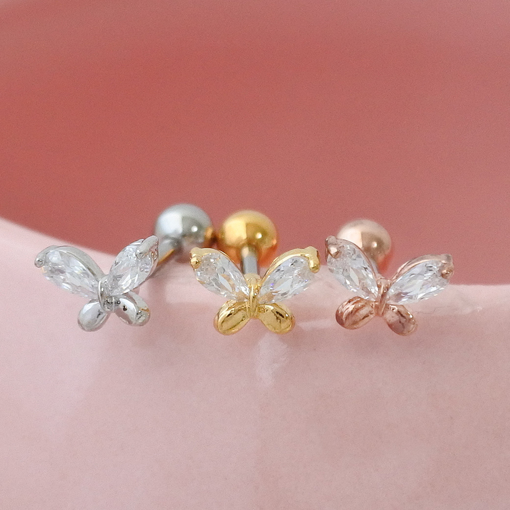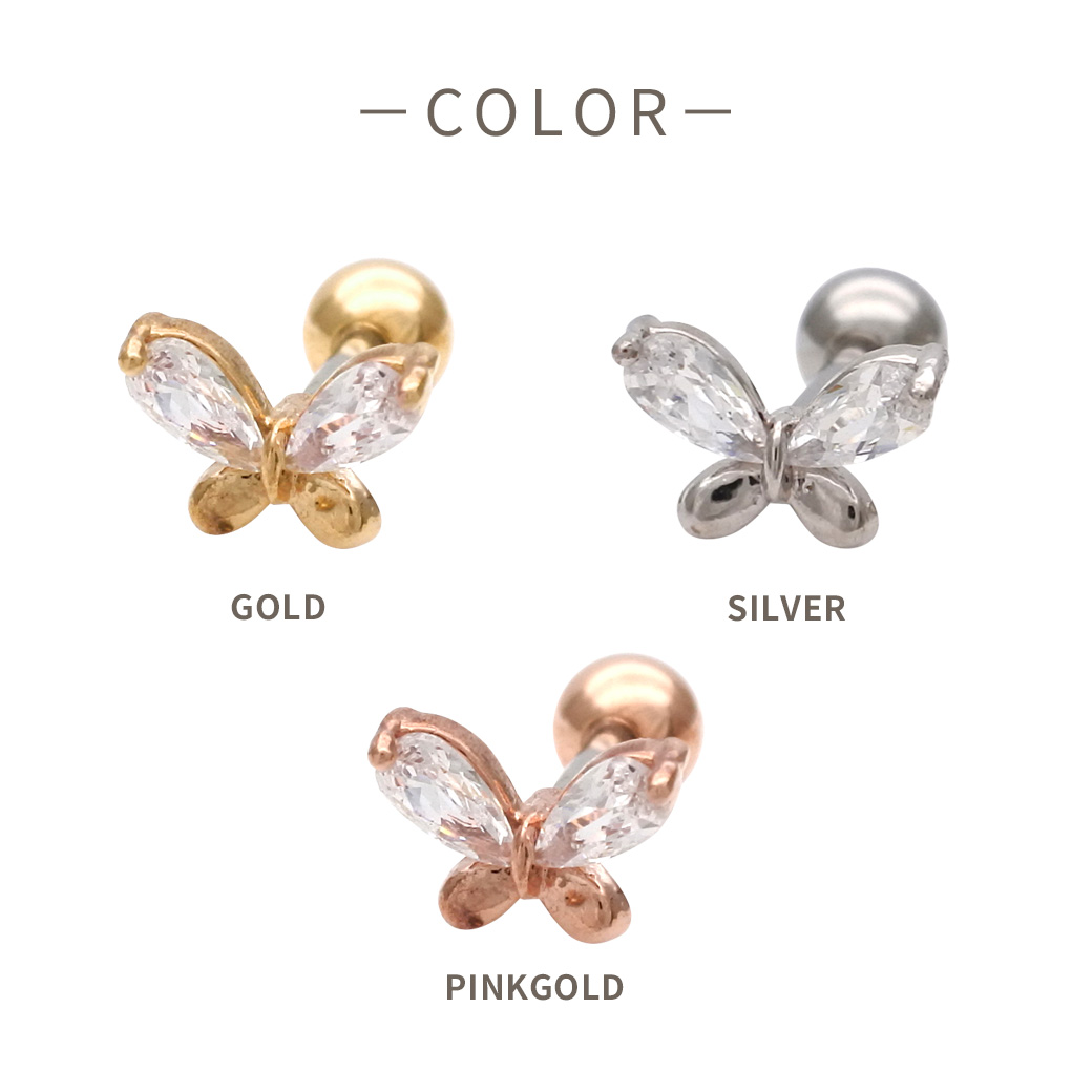 [14G 16G ]つるんとメタル がアクセント CZ 輝く 大人可愛い バタフライ デザイン ストレート 軟骨ピアス ヘリックス ボディピアス 0886