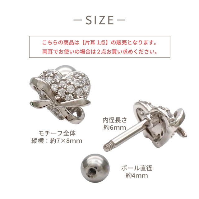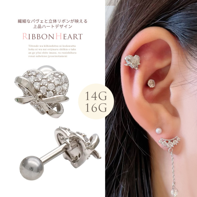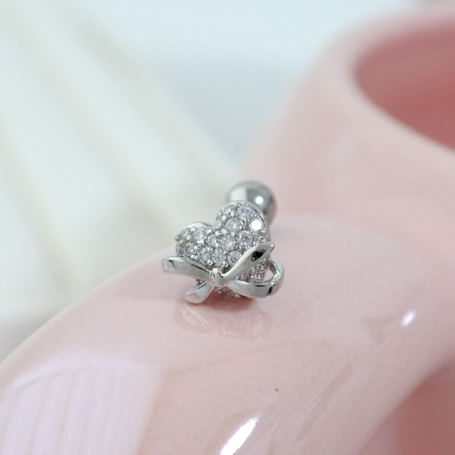 [14G 16G ]繊細なパヴェ と立体リボン が映える上品ハート デザイン ストレート 軟骨ピアス ヘリックス ボディピアス 1082
