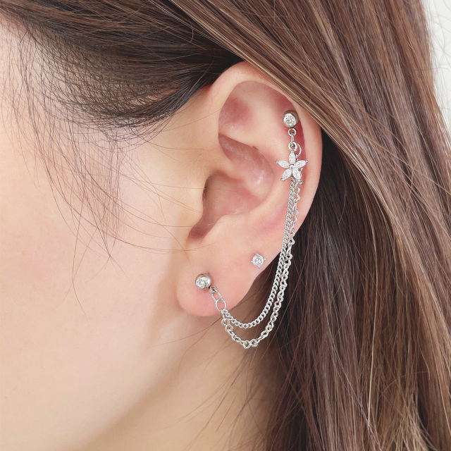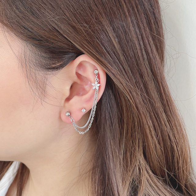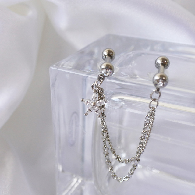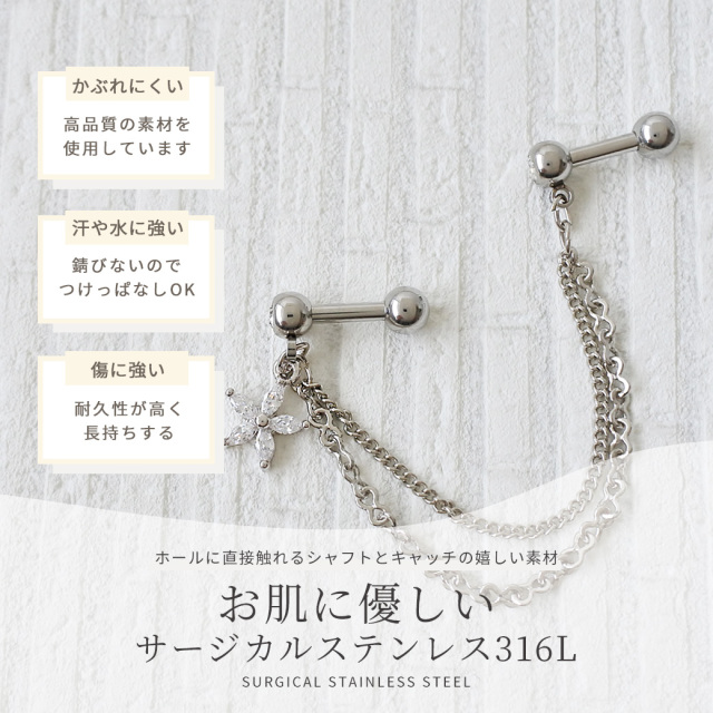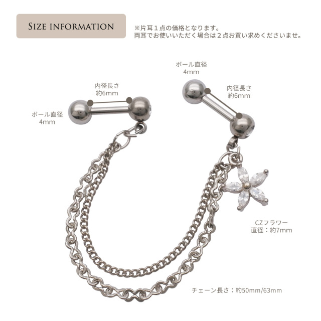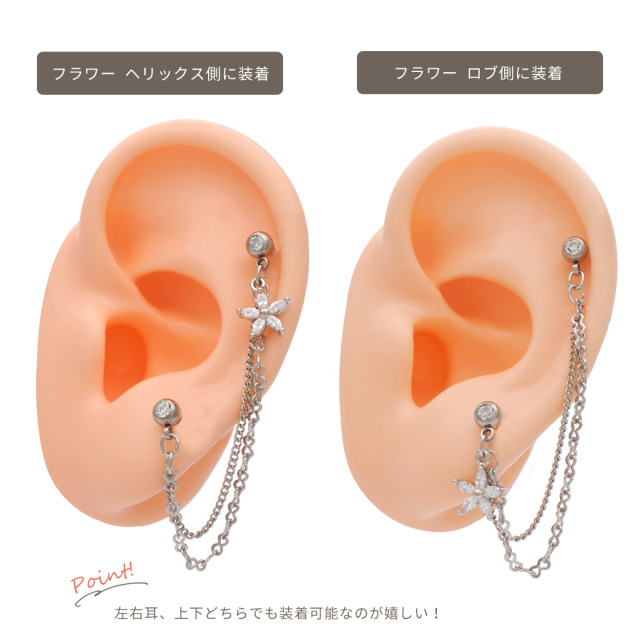 [14G 16G ]2つのホールを繋ぐチェーン ゆらゆら♪CZ フラワー ジュエル チャーム flower 軟骨ピアス ヘリックス ボディピアス 0061