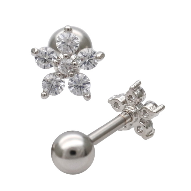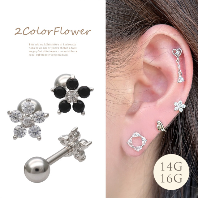 【5月新作】[14G 16G ]耳元に咲く、大人女子にぴったりモノトーン フラワー ジュエルストレート 軟骨ピアス ヘリックス ボディピアス 0209