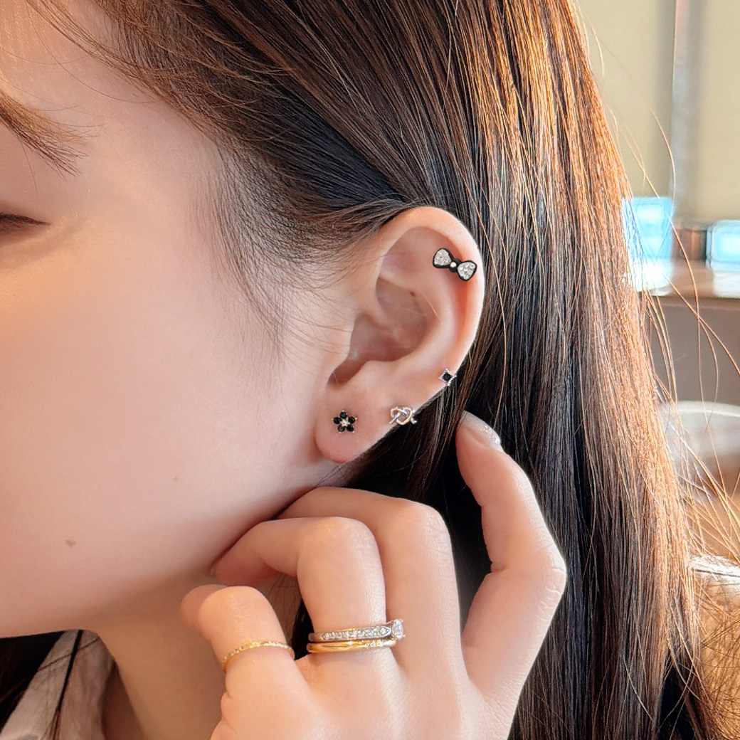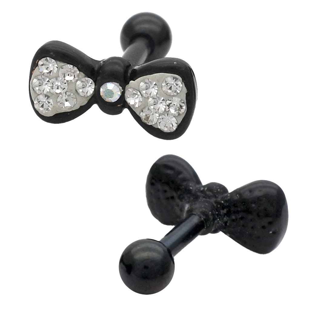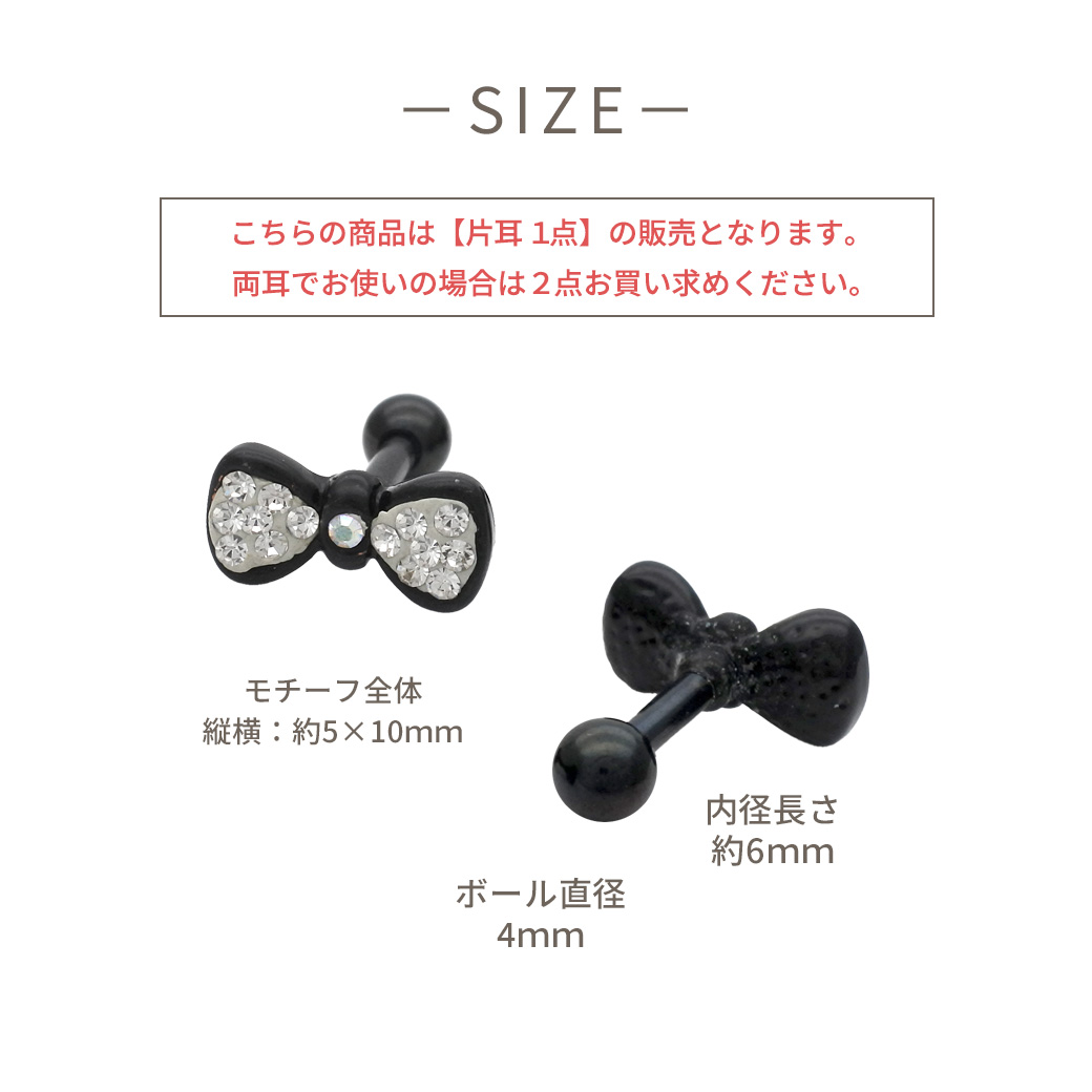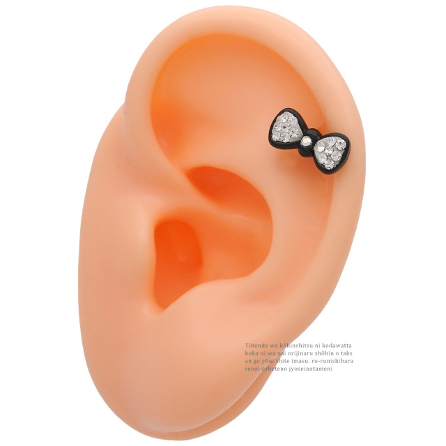 【4月新作】 [14G ] コロンとしたフォルムが可愛いラインストーン 輝くモノクロ リボン ストレート 軟骨ピアス ヘリックス ボディピアス 0364