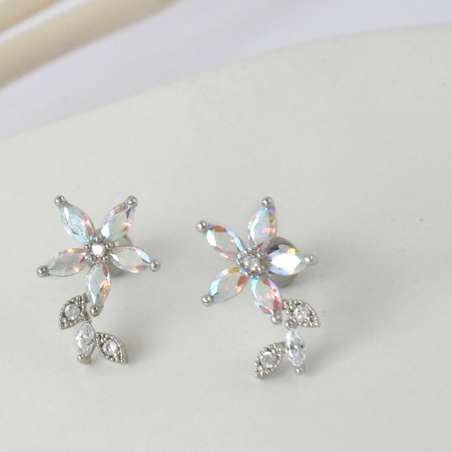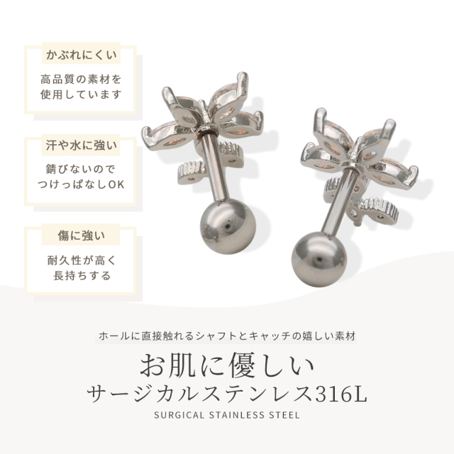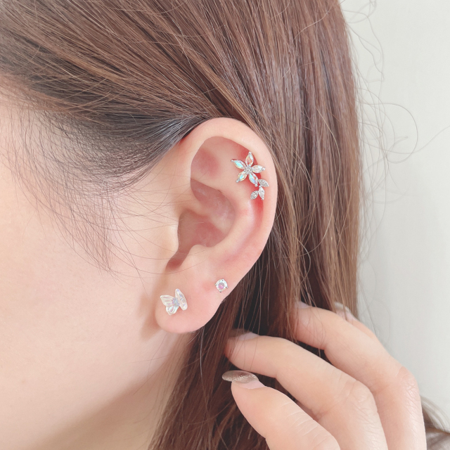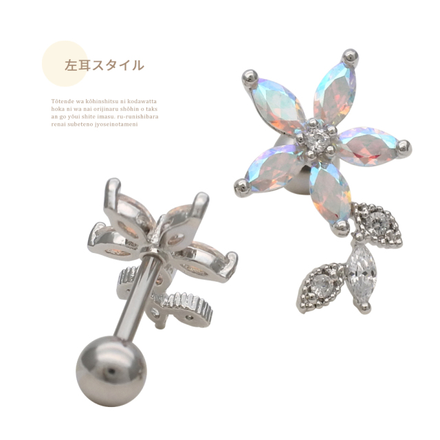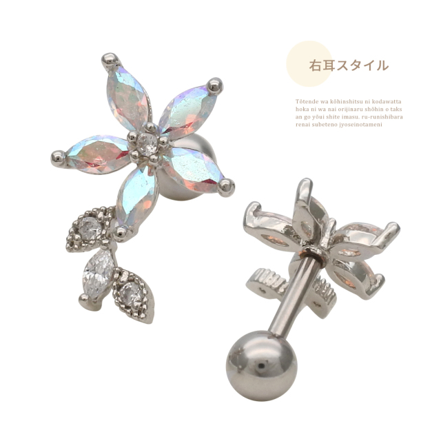 [14G 16G]リーフがデザインされた上品な華やかさ。表情変わる オーロラ キュービックジルコニアフラワー flower 花 軟骨ピアス ヘリックス ボディピアス 0461